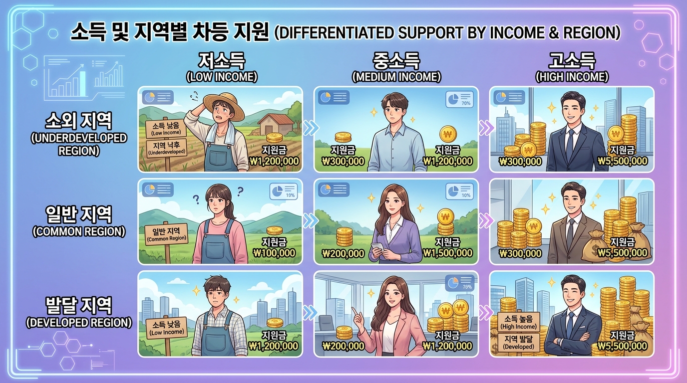 이번 고유가 피해지원금은 소득 수준뿐만 아니라 거주 지역을 함께 고려하여 차등 지급됩니다. 1인당 최소 10만 원에서 최대 60만 원까지 받을 수 있으며, 가구원 수에 따라 합산 지급될 수도 있습니다.