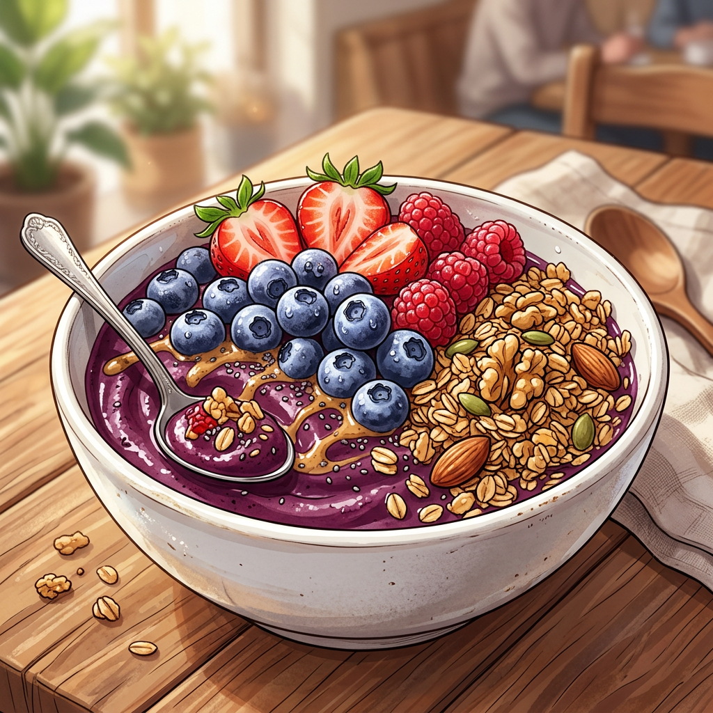 메가베리 아사이볼은 냉동 블루베리, 딸기, 라즈베리가 그래놀라와 어우러진 건강한 디저트입니다. 시원한 베리 스무디 베이스라 여름철 빙수 대용으로도 최고예요.