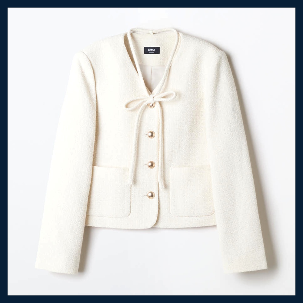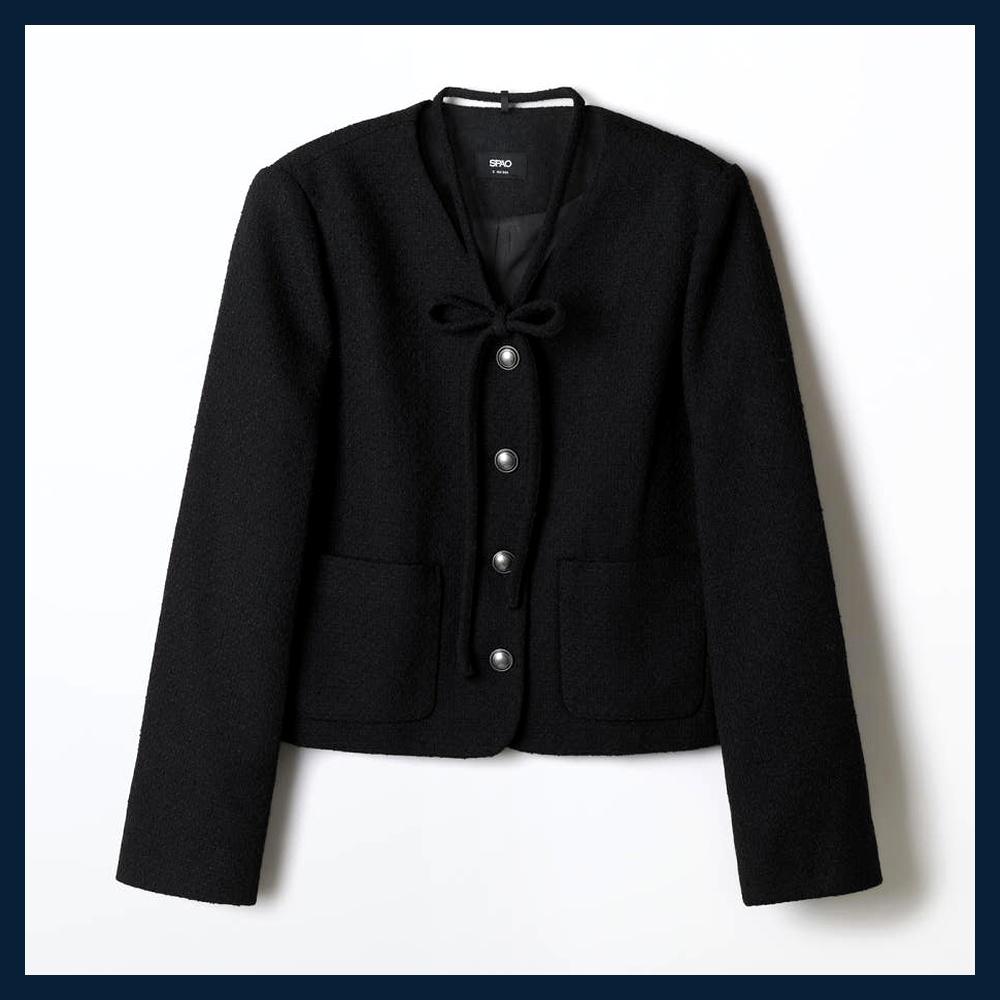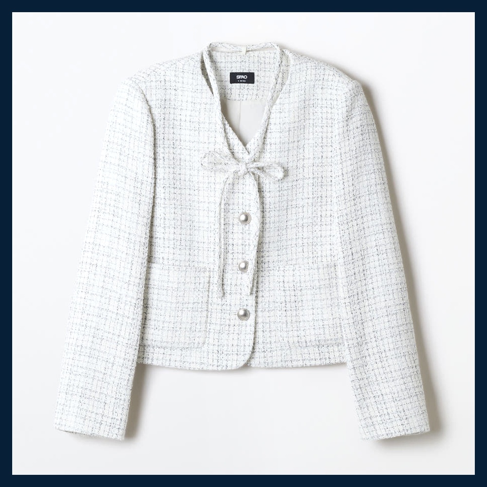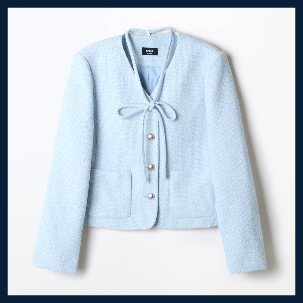 이 제품의 핵심은 바로 타이 스트랩 디테일입니다. 단순한 트위드 재킷이 아니라, 허리 라인을 조절할 수 있는 스트랩 덕분에 여성스러운 핏을 연출할 수 있어요.